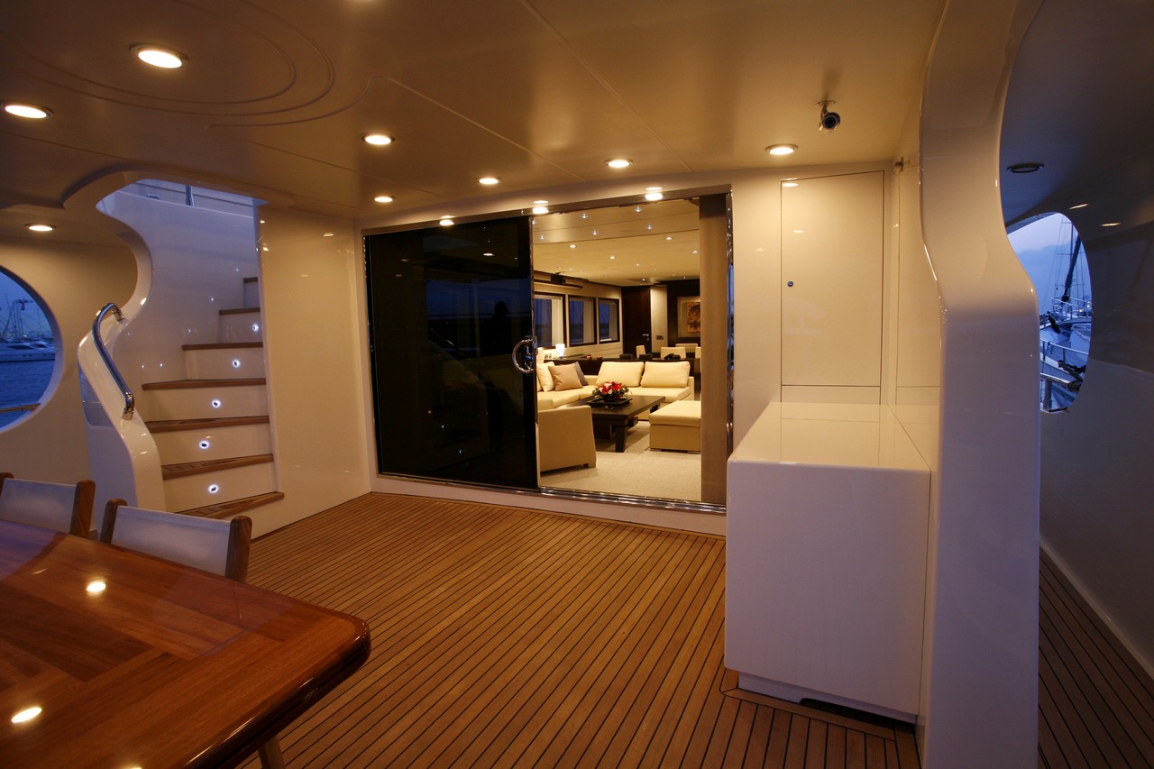 This motor yacht offers a large flybridge deck and an outdoor Spa Pool pool as well as water sport ‘toys’.