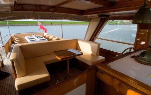 On the large romantic aft deck you will find a dining table for 10 persons and aft a full length sofa, immediately behind the wheelhouse you have a U shaped sofa and drinks table. The salon is at the same level, has 4 easy chairs and offers a wonderful view in all directions, when she is cruising.
