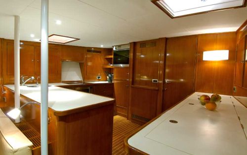 Downstairs forward, there is a large salon/galley area which was completely rebuilt during the refit. The Inside Dining and open Galley area offers a fantastic ambiance with the atmosphere of the sixties. The galley is fully equipped.
