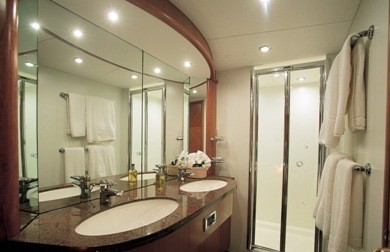 Below decks, M/Y Serenity offers comfortable accommodation for 8 guests in four spacious cabins. Her cool and chic neutral décor offers a welcome respite from the warm Mediterranean sun.