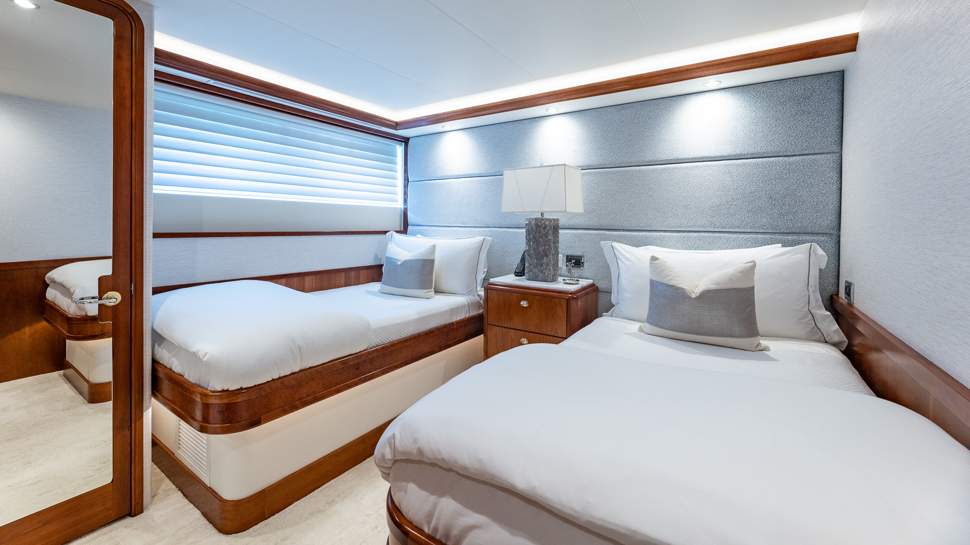The yacht’s lovely dining area is enhanced by Waterford china and crystal, as well as full silver service. Beyond is a bright and cheerful country galley, just right for less formal meals.
