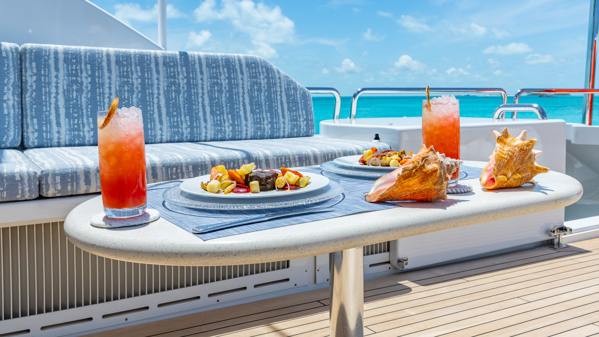 The spacious aft deck, with its large table and seating area, is another popular gathering spot, whether for morning coffee, lazy afternoons, or cocktails and dinner in the gentle breezes.