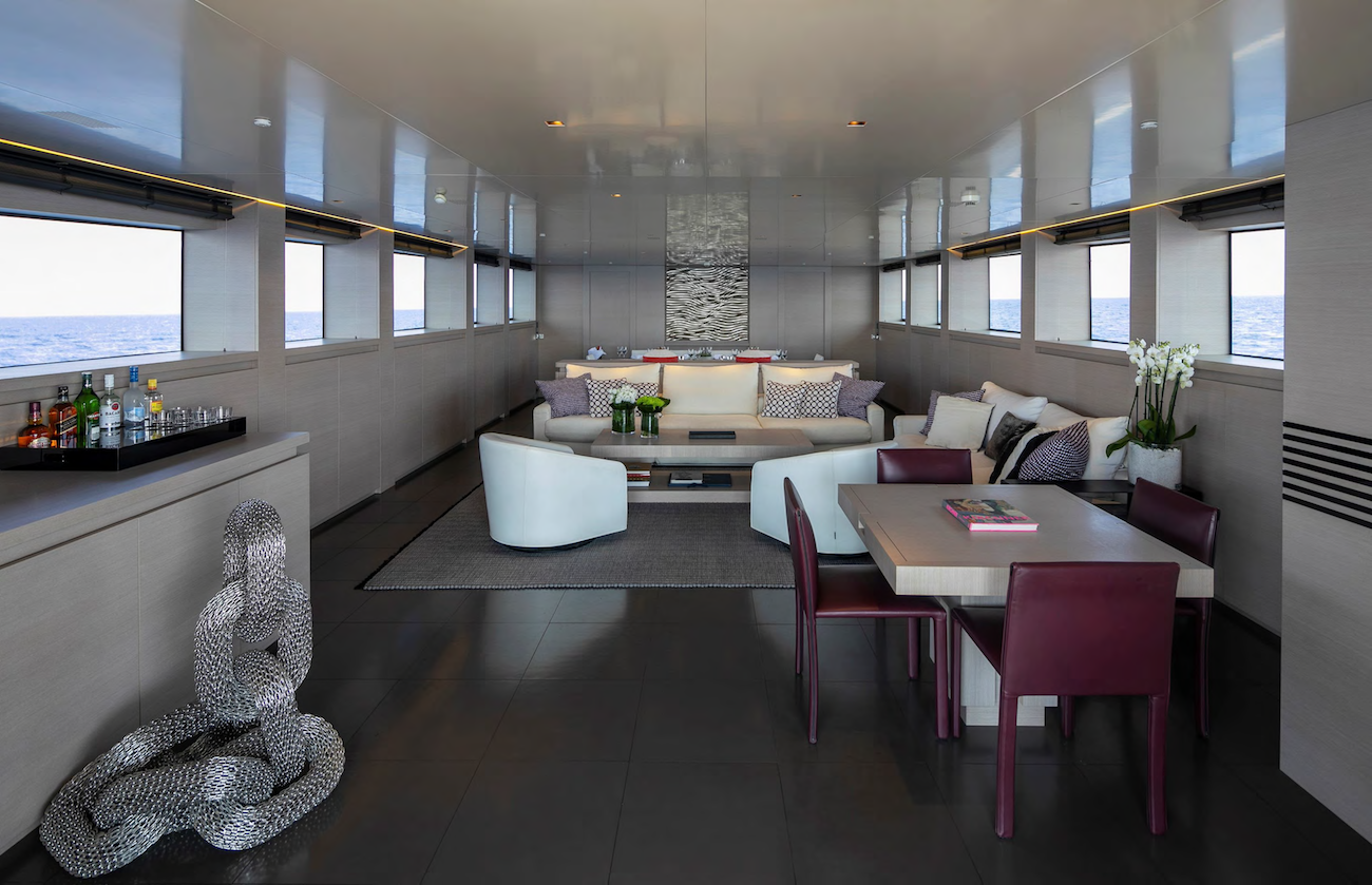 Luca Dini designed the spectacular interior which is breath-taking with grey being the predominant colour onboard. Floors have been chosen in anthracite grey leather specifically for the owner while the walls are in grey oak.