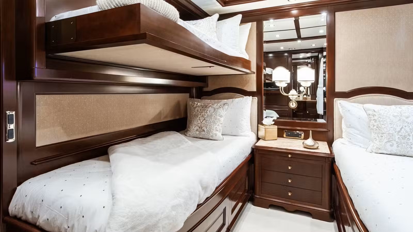 With accommodation for up to 10/12 guests and fully MCA Commercial her Master Suite is located on the main deck with the remaining cabins, 2 VIP and 2 Twin Guest Cabins below deck, all exquisitely designed with soft furnishings and marble bathrooms.