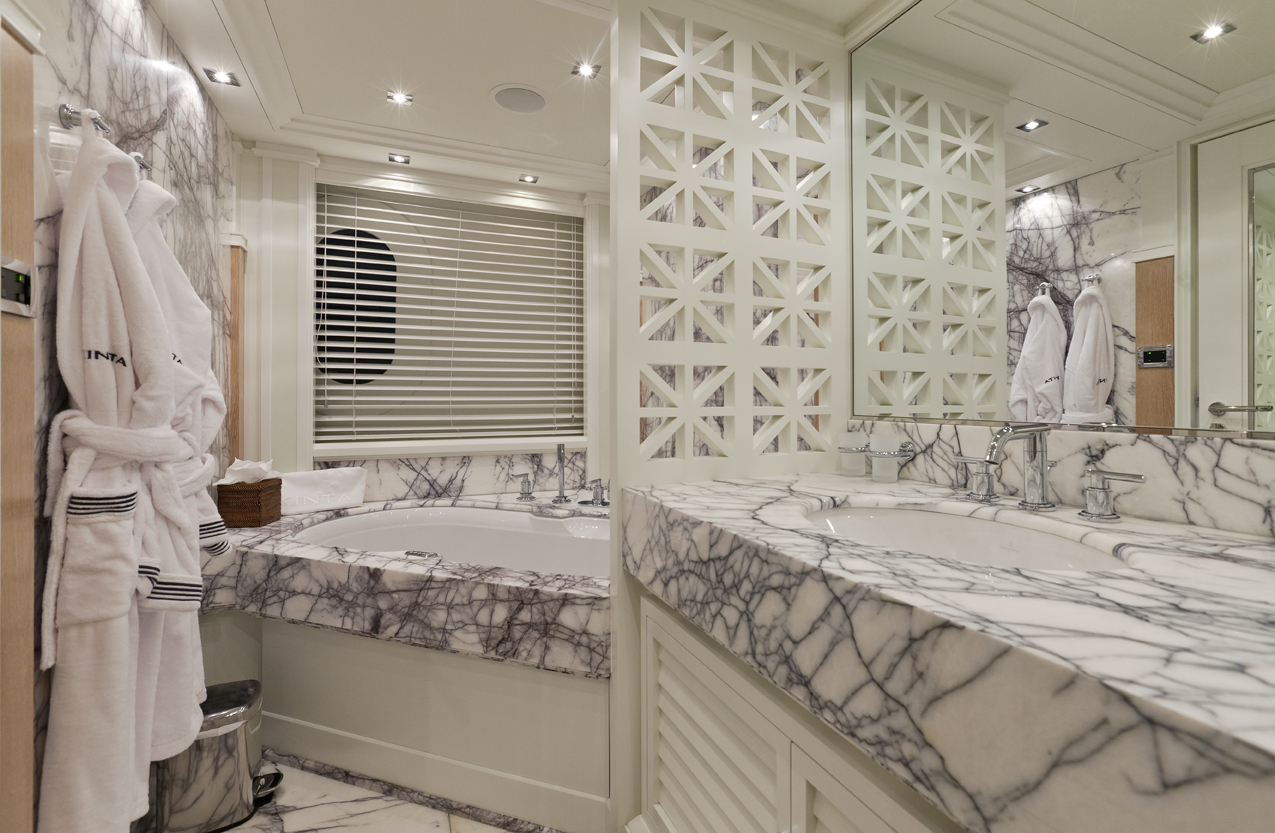 Forward of the main lobby is the oversized master cabin which extends across the full beam of the yacht and is again complimented with full height windows offering spectacular panoramic views. The master stateroom includes a private lounge and office, a large walk-in wardrobe and an ensuite bathroom.
