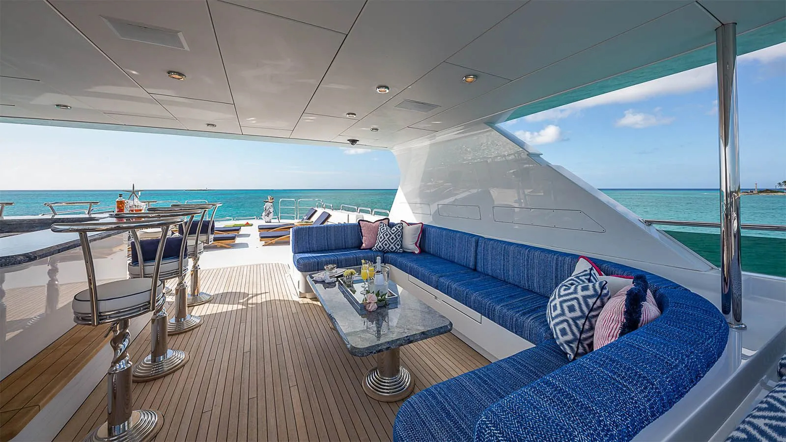 On the upper deck, there is sky lounge with ample seating, games table, wet bar and wide windows. One of the main features is the elevator, which connects all decks, making it easy to get around this luxury superyacht.