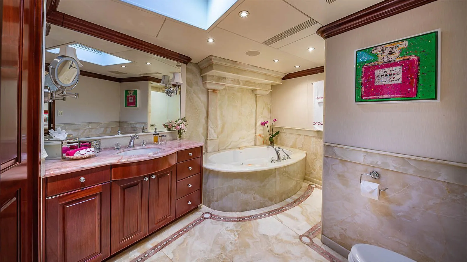 Another full-beam cabin, VIP, has an ensuite bathroom with marble shower and spa pool tub. There are also 2 twin and 2 queen cabins, each with its bathroom.