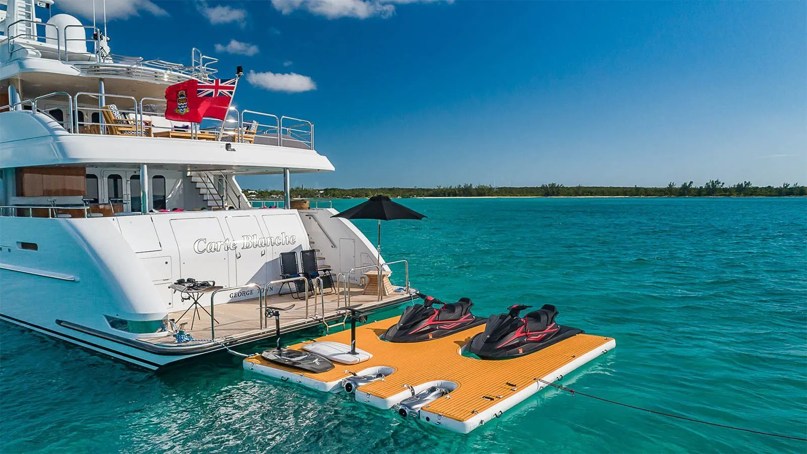 NOTABLE FEATURES of CARTE BLANCHE 161': ~ Panoramic views in the salon ~ Opulent interior styling ~ Alfresco & formal dining areas ~ Jacuzzi ~ Wet bar ~ Outdoor seating area ~ Swim platform ~ Water toys