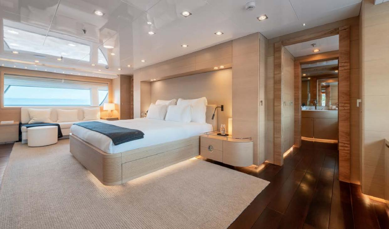 Twin CAT engines power the yacht and have cruising speeds of 12 knots and top speeds of 15 knots. She is fitted with zero speed stabilizers for optimal comfort.