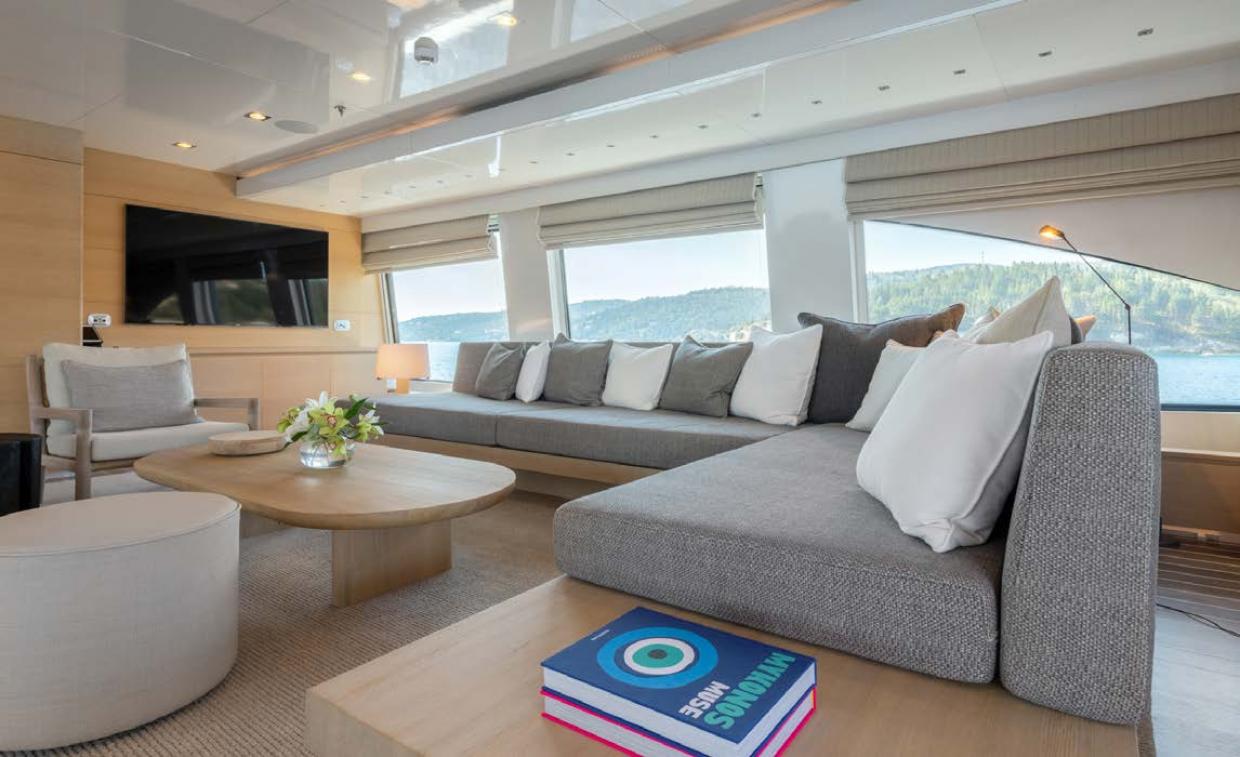 The main salon is semi-open plan, with a lounge aft and formal dining forward. Throughout the yacht, the furnishings are neutral, yet bespoke, creating a sophisticated atmosphere, with a relaxing serene feel. There is an upper sky lounge which features further comfortable seating, ideal for socializing.