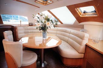 The salon is a spacious, offers plenty of headroom and is a comfortable area in which to relax over a meal or escape the afternoon heat. Her sleek leather upholstery and generous windows offer her guests plenty of light an opportunity to take in the wonderful sea views.