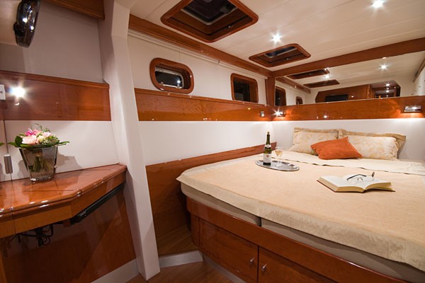 Catsy’s decks are ample and the design has made the most of her 62ft by adding a flybridge that opens up the cockpit area and gives the guest another deck to enjoy the sweeping views while under sail in complete comfort. Underwater lights are a feature that will delight guests at anchor each night.