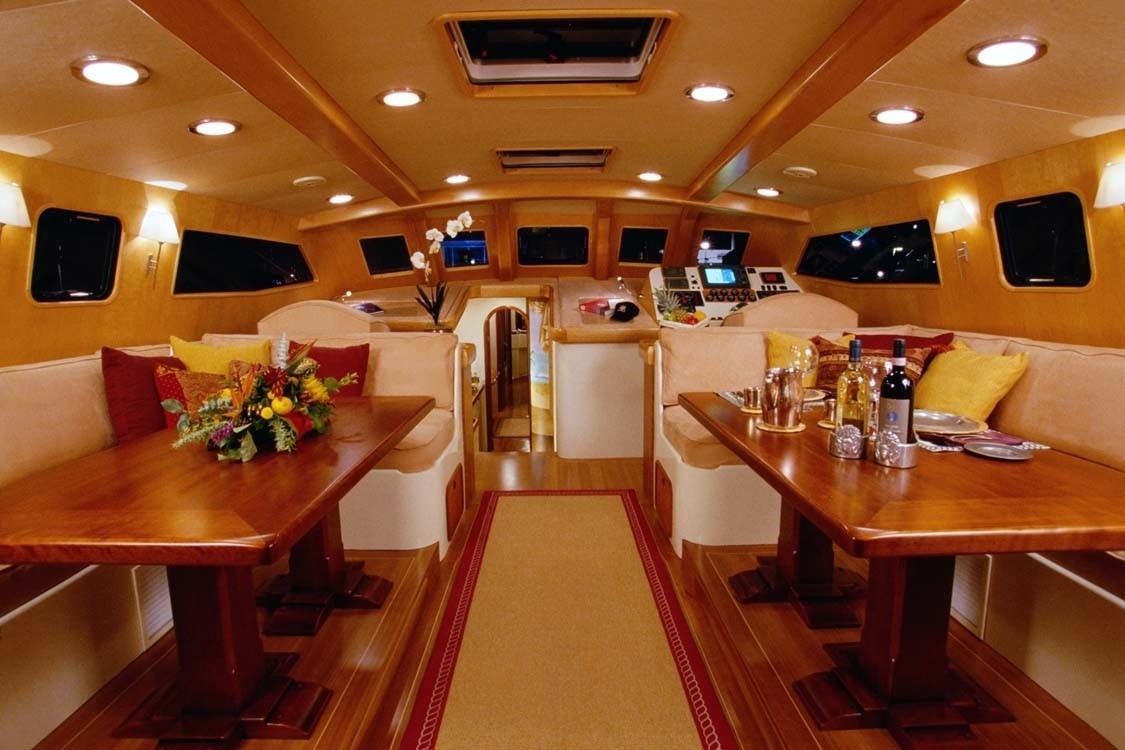 GRIFONE can host 6 guests in 3 cabins. The main cabin is in the centre of the boat and has an ensuite bathroom. Two twin cabins share an ensuite bathroom and the crew has separate quarters.