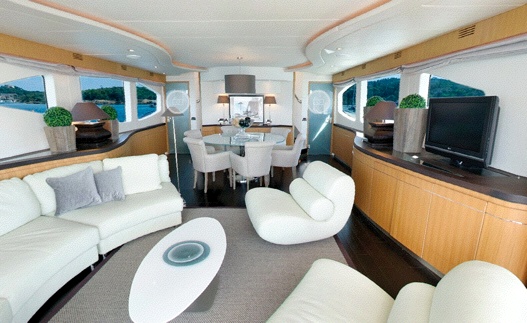 Upon entering the salon of Motor Yacht FAMILIA, you will immediately notice the light and space generated through her large elongated panoramic windows. The open salon includes a lounge area plus a dining table ideal as an open style entertainment area.
