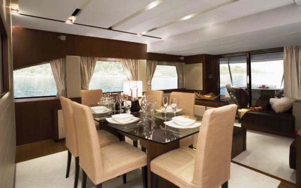 On the main deck, the spacious aft dining area leads indoors to the open salon and dining room which further leads to the galley and bridge. The main salon is all framed by large panoramic windows which complete the light materials with oodles of natural light.