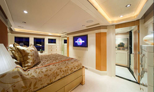 Luxury motor yacht AERIE can accommodate a total of 8 guests in 4 cabins, one of which is convertible. Her master cabin located below decks has a King bed, a desk and his and hers bathroom- hers with Spa Pool and TV, his with a large shower.