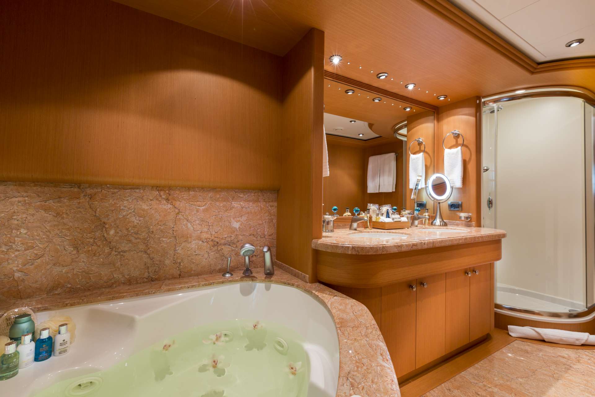 The superyacht’s full beam owner’s suite on the main deck has a king size bed and an ensuite bathroom with a bathtub and shower. There is a push-up TV screen at the foot of the king size bed, which can also be rotated towards the bathroom so that the owners can watch a movie while taking a bath.