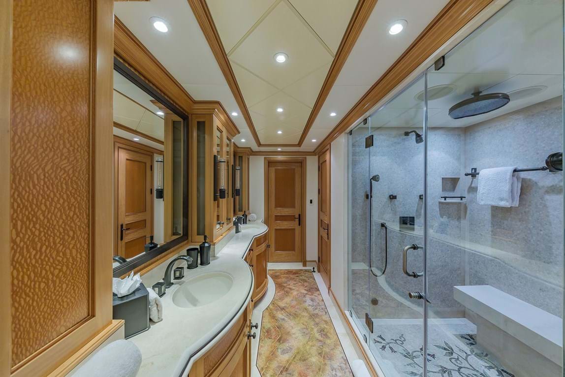 On the main deck, forward of the salon and dining, is the full-beam master cabin offering a king-size bed, his and hers wardrobes, study and spacious en-suite facilities. Further guest accommodation is below decks in 2 VIP and two guest cabins.
