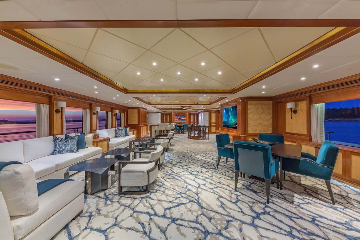 The salon is on the main deck offers ample seating in an inviting social atmosphere, surrounding a generous coffee table.