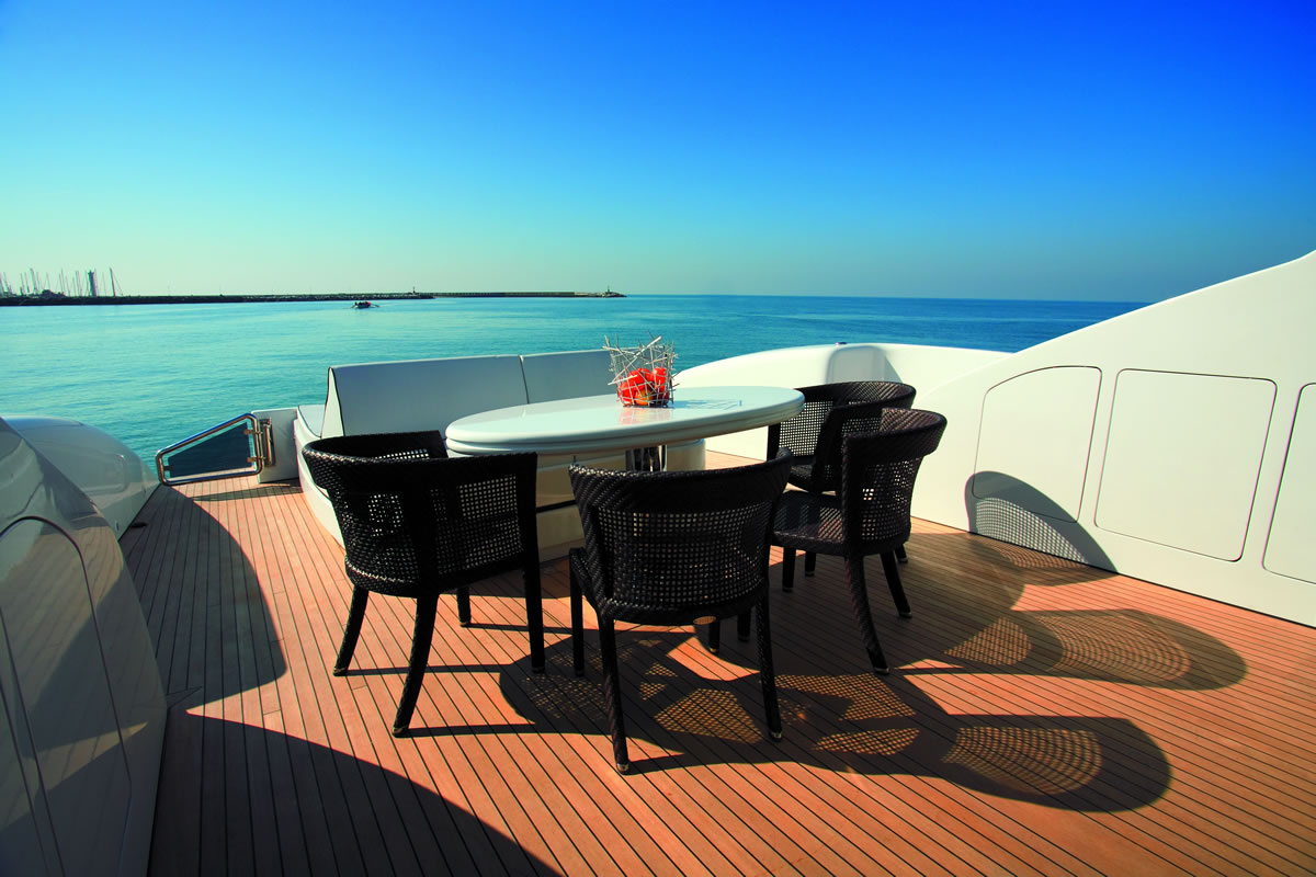 Exterior living aboard the motor yacht MARACANA is ample offering an alfresco dining option, large aft settee and convertible sunpad, extended swim platform and double sunpad on the foredeck.