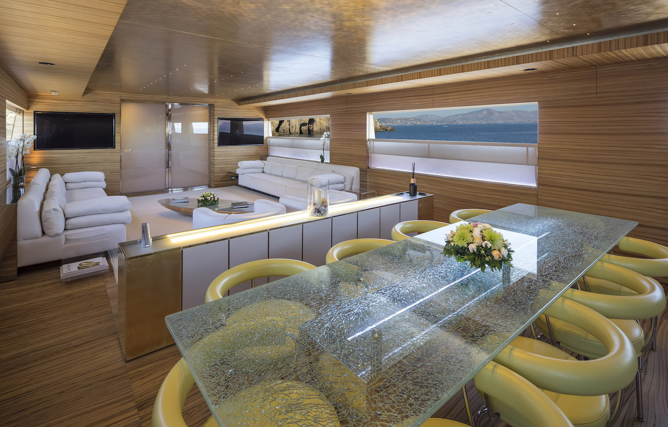 A low, silver leaf divider unobtrusively divides the salon from the dining area.
