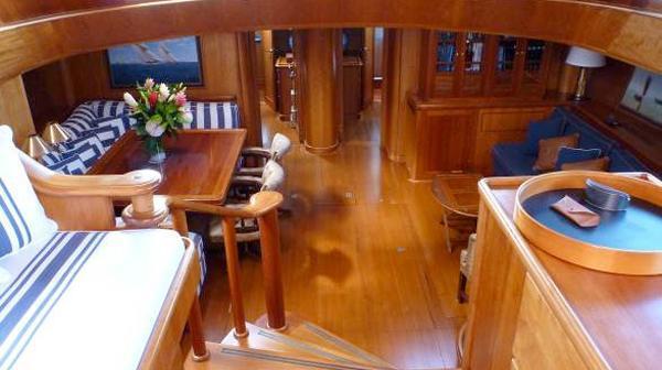 “Going below through a companionway deckhouse / chart room, we find two staterooms, one of which serves as a passage to the main cabin, alternatively accessible from the deck, which is fitted with built-in berths and transoms.