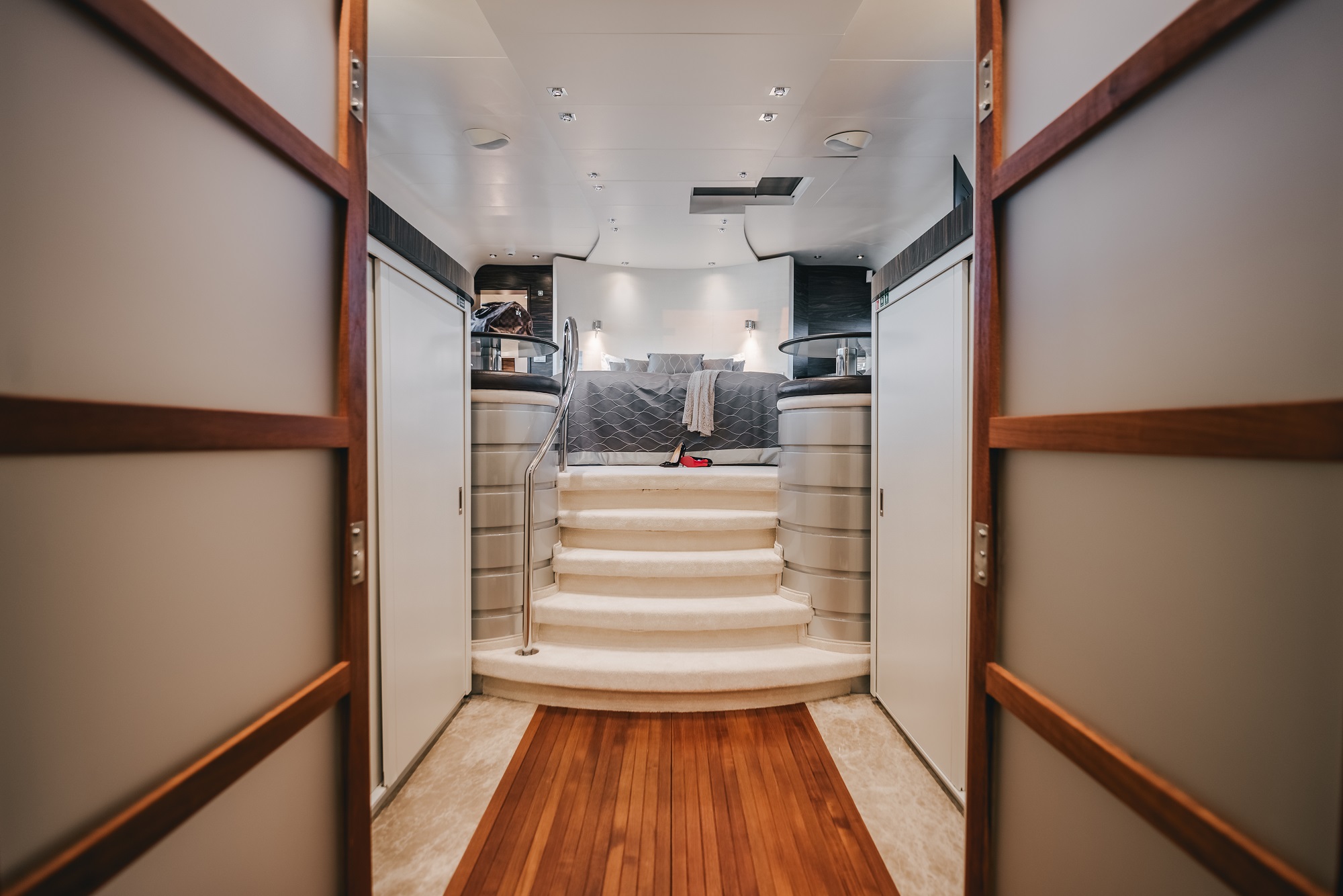 The master suite is located on the main deck forward and spreads the entire beam of the vessel. This stateroom has fabulous panoramic views, a large king-sized bed, a desk, electric blinds, a large TV and a generous closet.