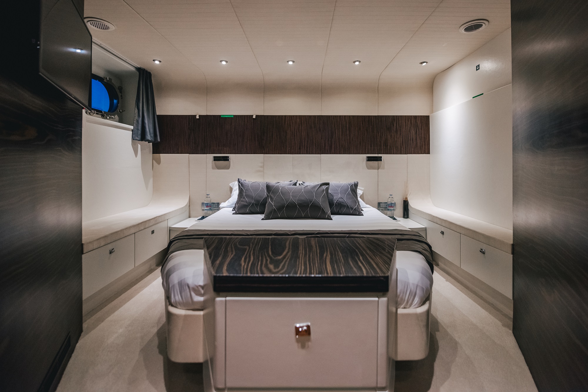 The master suite is located on the main deck forward and spreads the entire beam of the vessel. This stateroom has fabulous panoramic views, a large king-sized bed, a desk, electric blinds, a large TV and a generous closet.