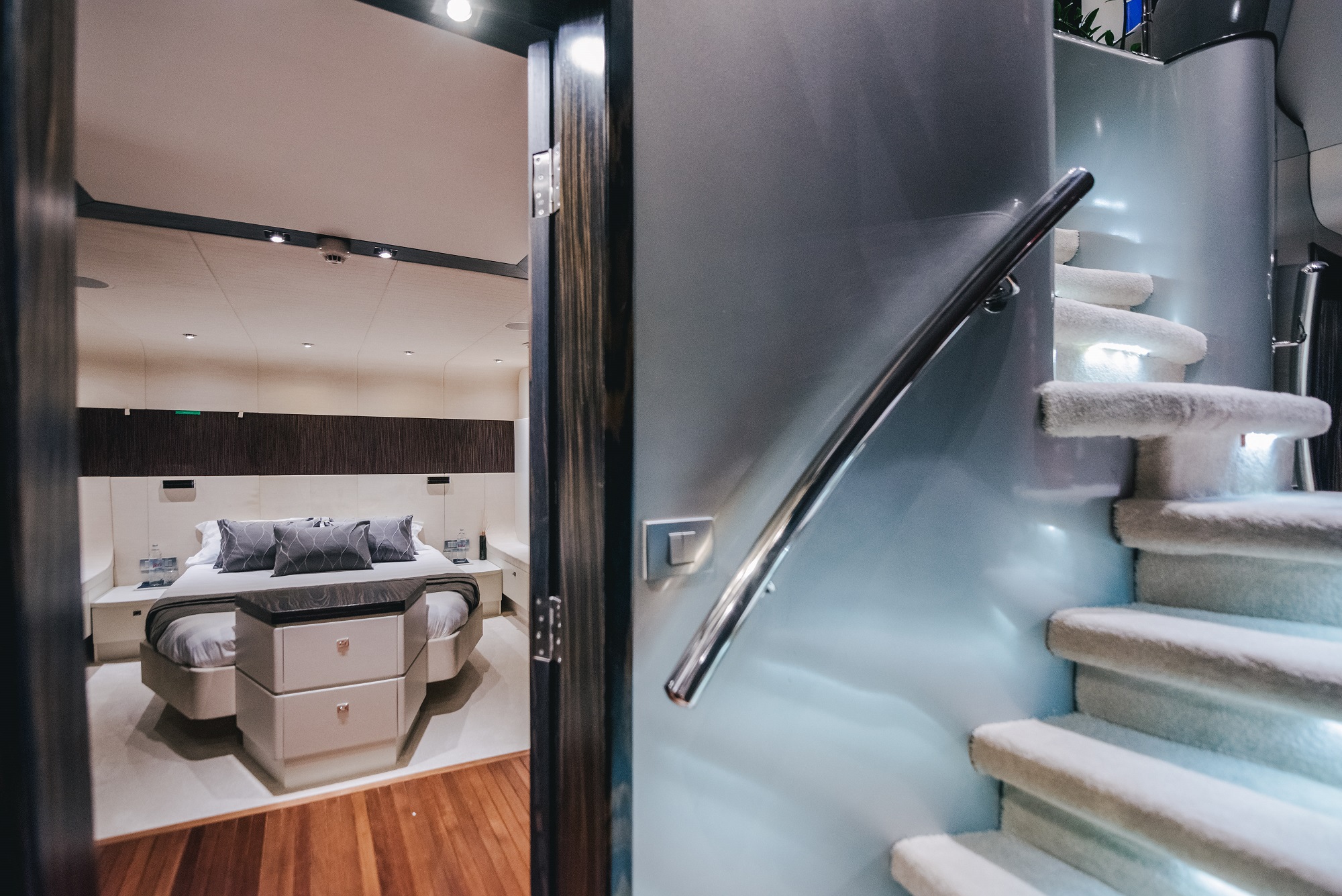 The master suite is located on the main deck forward and spreads the entire beam of the vessel. This stateroom has fabulous panoramic views, a large king-sized bed, a desk, electric blinds, a large TV and a generous closet.