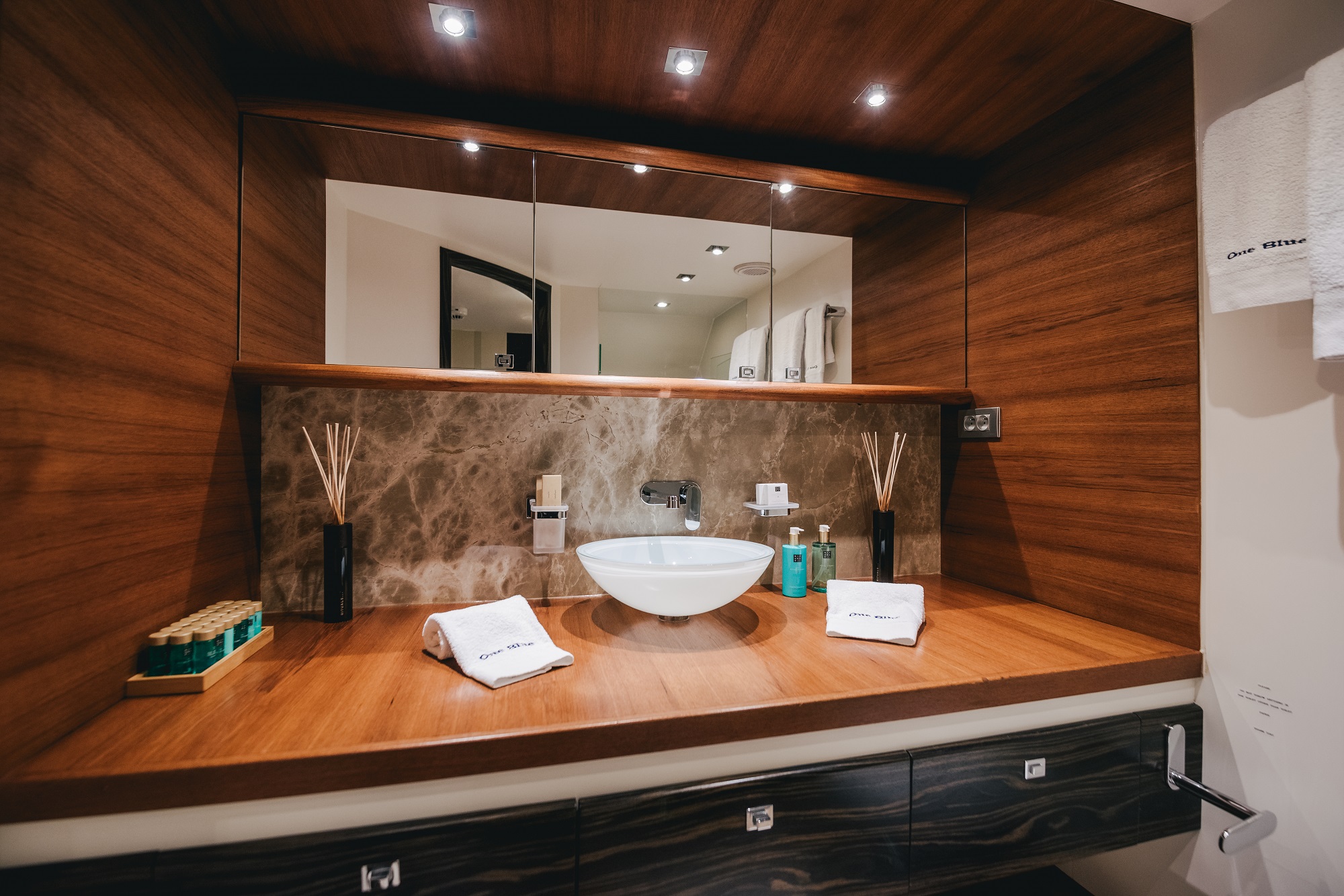 The sunken ensuite bathroom is equipped with shower, a bath tub and two basins. Further accommodation is located on the lower deck, and includes a spacious VIP cabin with a queen bed, TV, wardrobe and ensuite bathroom with a shower. The two double cabins are identical and offer double beds, a TV, wardrobe and ensuite bathroom with shower.