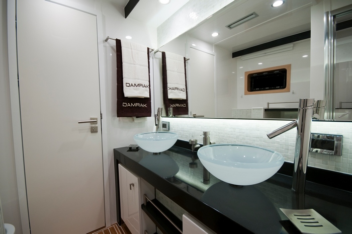 Motor yacht DAMRAK has two wide master cabins in her bow section with en suite bathrooms. There are two guest cabins in the aft. Both have double beds and an en suite bathroom. On the Sunreef 70 the galley and crew cabins are ...