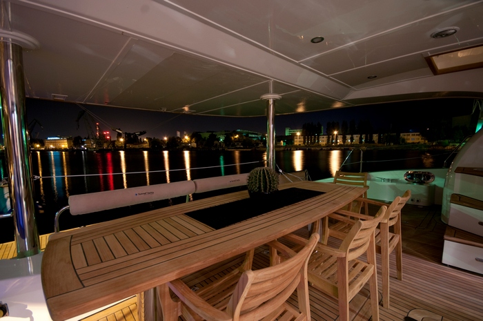 The catamaran motor yacht’s spacious saloon has been designed for entertainment and has large casual sofas and a dining table.