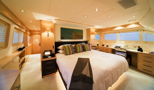This simple but vibrant decor continues through the four guest cabins consisting of a large master suite, 2 doubles and 1 twin cabin. Each cabin is finished with interesting materials including river stones in the ensuite heads.