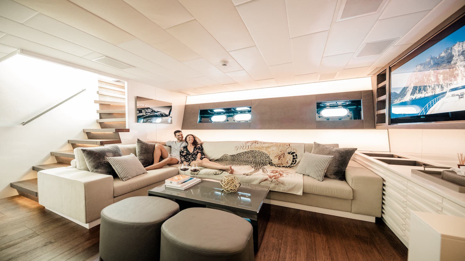 NOTABLE FEATURES: ~ Top speed of 41 knots ~ Vast salon with dining area ~ Alfresco dining space ~ Stylish interior ~ Stabilisers ~ Wi-fi