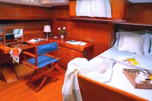The stunning master stateroom is finished in teak and features a queen-sized bed, lounge area and desk. The double guest cabins have a double and single bed. For recreation aboard there is TV, Video, CD and cassette stereo system in the salon area which is the full width of the yacht and feels very spacious.