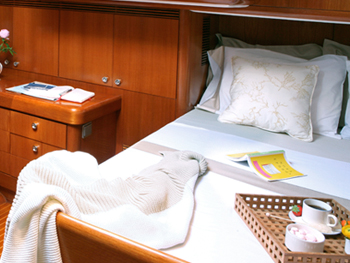 The stunning master stateroom is finished in teak and features a queen-sized bed, lounge area and desk. The double guest cabins have a double and single bed. For recreation aboard there is TV, Video, CD and cassette stereo system in the salon area which is the full width of the yacht and feels very spacious.