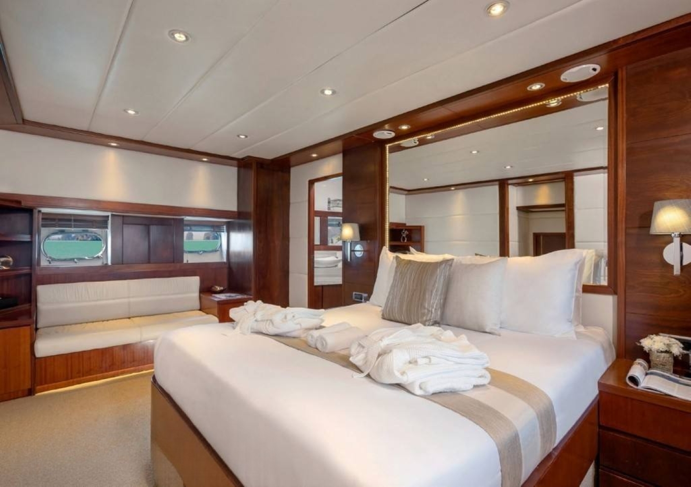In her 96 feet, she affords a surprising array of features including a fantastic flybridge with a Spa Pool, barbeque, dining area and sun pads. Internally, Motor Yacht MIA KAI is clean and simple with neutral beige tones complimented by rich door woods.