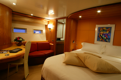 Her spacious interior below decks includes a large aft owner's stateroom, a double cabin amidships, and a VIP guestroom fore.