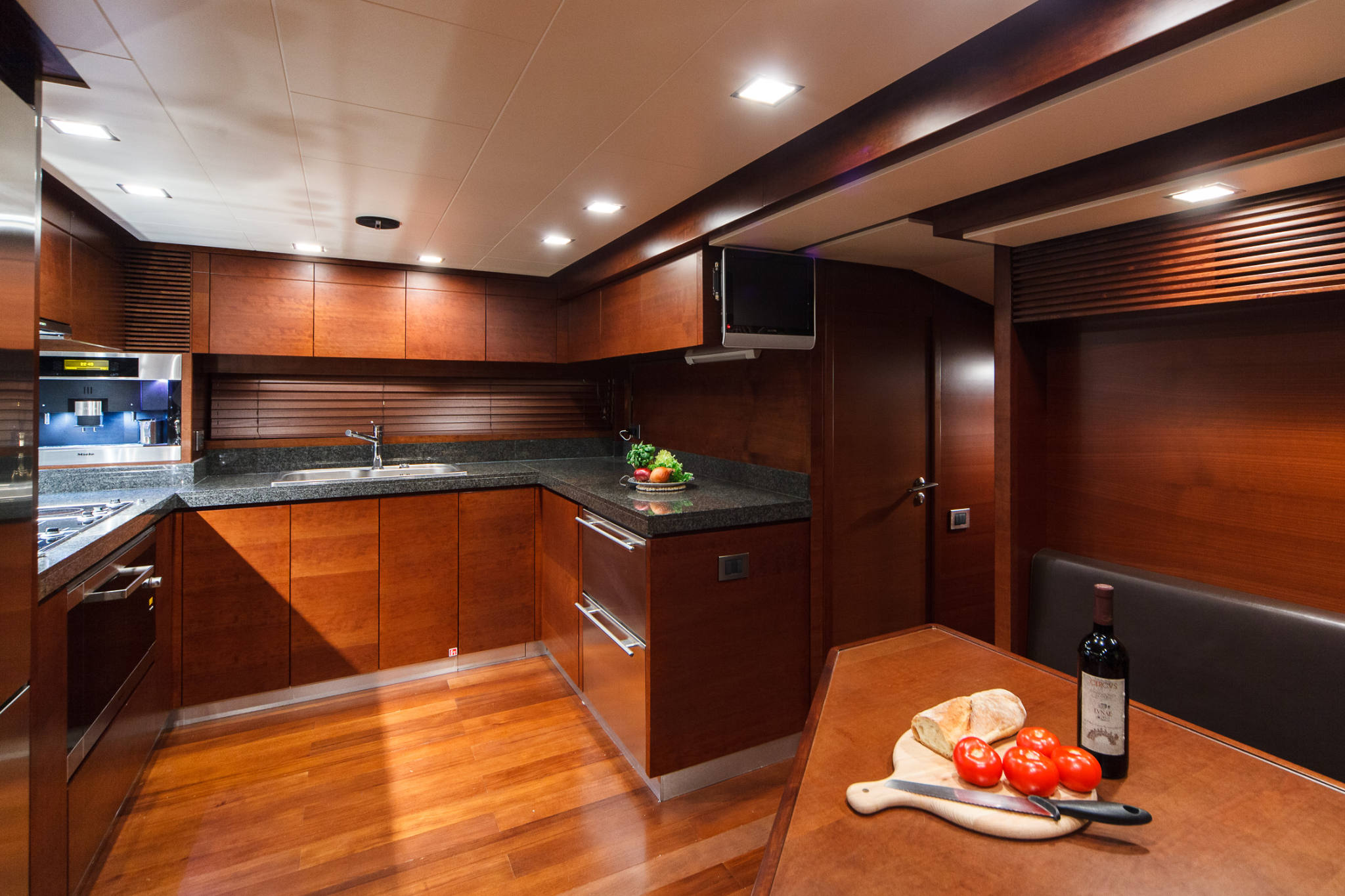 The Main Deck has a large alfresco dining area (270cm x 110cm), another dining area to fit up to 10 guests, a cosy salon with ample seating and entertainment system plus a separate media room with a convertible sofa a day head and a galley for light refreshments.