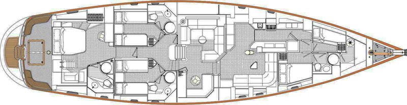 The starboard and port aft cabins are similar with twin berths and a hanging locker and drawer storage. There is an additional Pullman berth with 2” mattress. These cabins have ensuite heads with a separate shower stall.