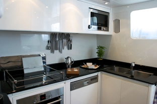 Falcon Motor yacht LEI MAONIA offers accommodation for eight guests in four staterooms, each with ensuite facilities. The Master stateroom, one double cabin and two twins are located on the lower deck. The cabins are equipped with a TV with DVD multizone and a Sony CD radio player.