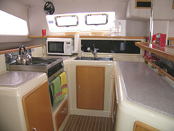 The roomy galley is the perfect place to watch your chef create your next gourmet meal, take an afternoon nap or just relax in the air-conditioning should you need a break from the sun. The aft deck offers dining for up to six ...