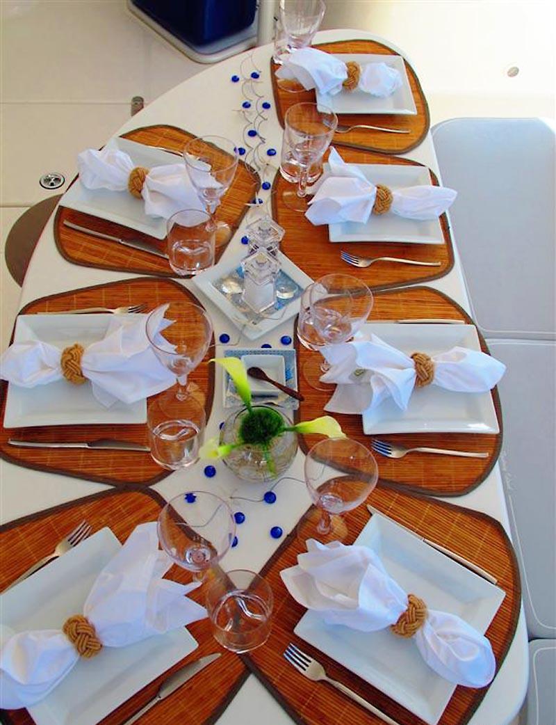 Fantasy Island large spacious cockpit has dining tables on both sides and a permanent Carbon-fiber Bimini over head to protect you from the sun.