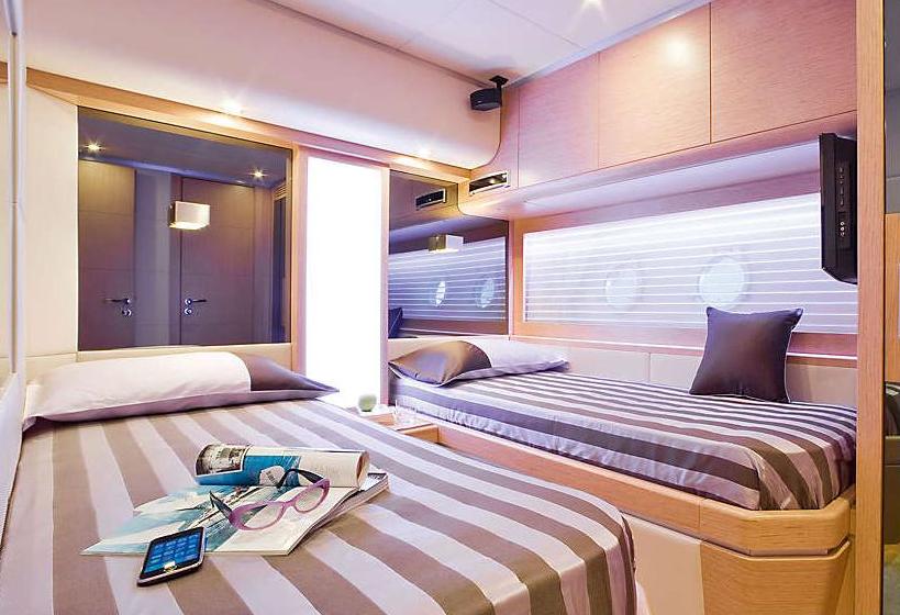 Luxury motor yacht Sascha can accommodate 8 guests in 2 double and 2 twin cabins. The owners cabin is modern and offers generous space which is complimented by the use of natural light throughout. The Master Cabin also boasts a ‘his and hers’ bathroom, connected by a wide shower room in the middle shown in the rendering below.