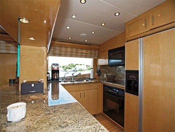 Sheer Bliss’s Galley opens to the salon with U-shaped seating breakfast table starboard side for informal dining. The well equipped Galley has granite table tops.