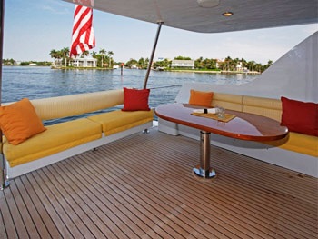 Sheer Bliss has a fantastic spacious teak aft deck with Wet bar and refrigerator. There is also a Stereo control pad and outdoor speakers. TV. So you can enjoy the music both inside and out. Up on the spacious flybridge, there is a Wet bar with a seating area and stools as well as two comfortable sized seating areas with large tables.