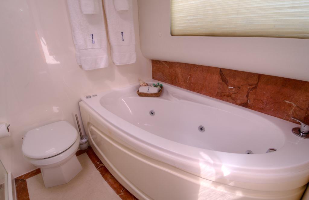The galley is down so the whole salon is for guest’s private use. The huge cockpit off the salon offers alfresco dining comfortable for 10 people with plenty of space for dancing or hanging out during the charter.