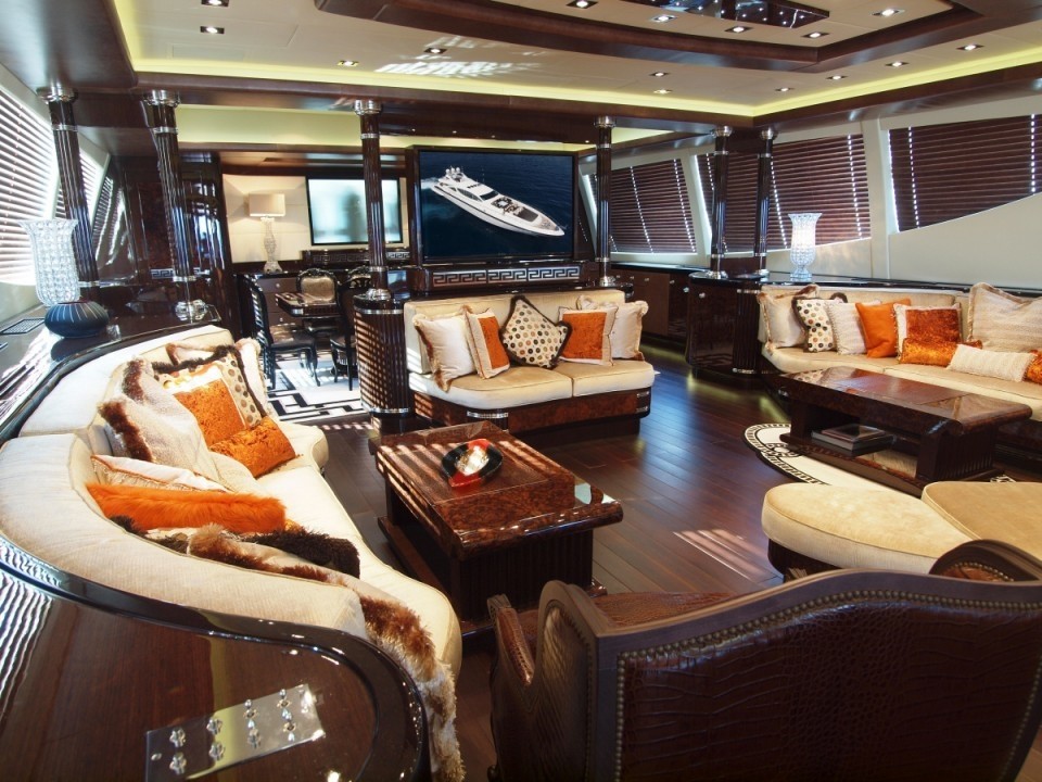 ZEUS had her naval architecture created by Stefano Righini and was built and conceived by Mangusta yachts. The elegant interior of the luxury yacht ZEUS is elegantly designed and features neutral fabrics and dark woodwork and a spacious main salon area.