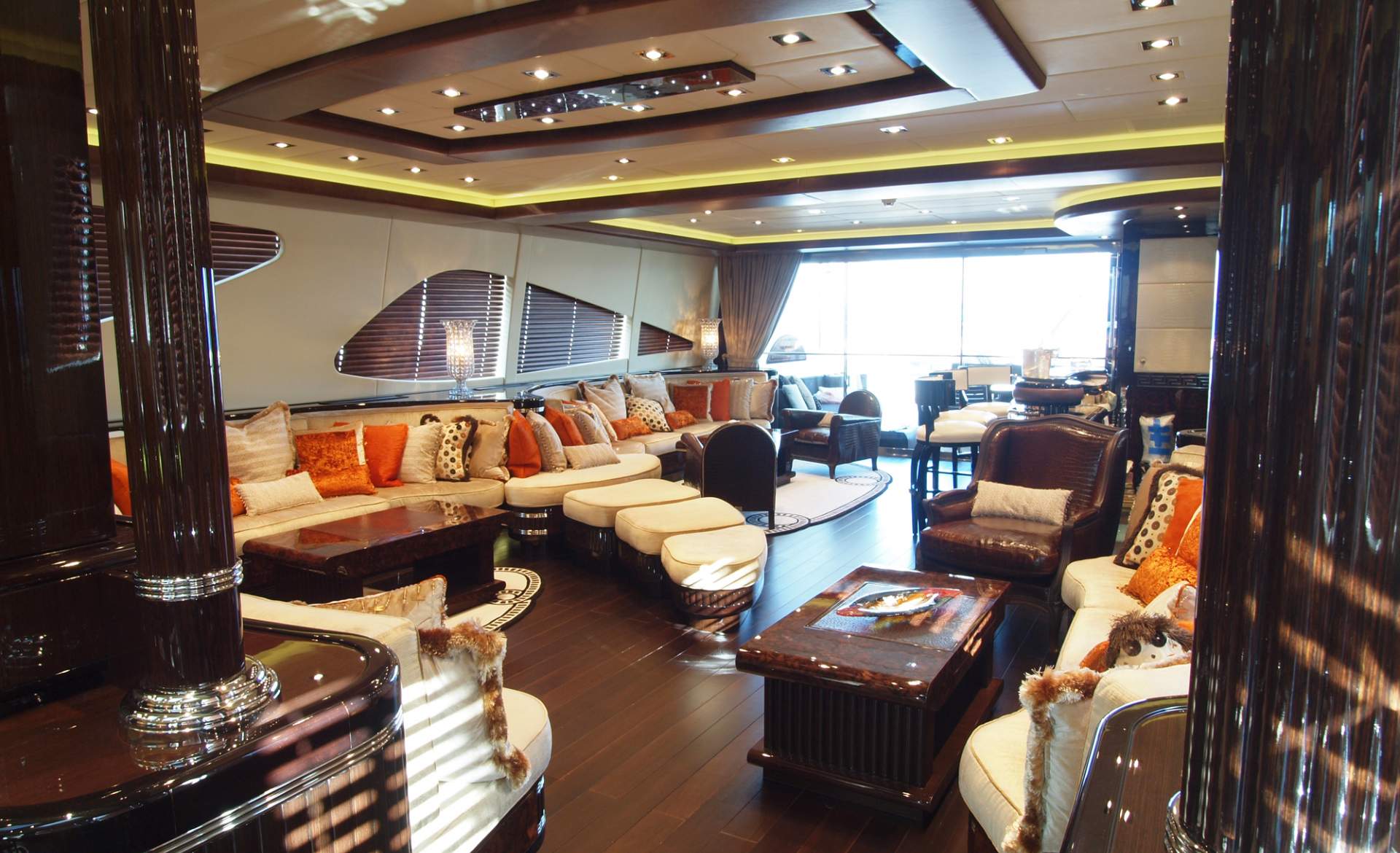 The elegant interior of the luxury yacht ZEUS is elegantly designed and features neutral fabrics and dark woodwork and a spacious main salon area. This space gives yacht charter guests easy access to sumptuous entertaining and seating and cocktail tables, a long bar.