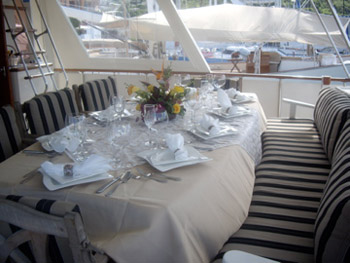 Her aft dining area is where guests can enjoy some fabulous alfresco meals while enjoying the views and her expansive foredeck offers plenty of space to work on your tan or perhaps relax and unwind in the four person Spa Pool tub ...